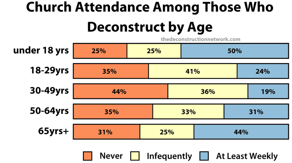 One thing is for sure, with 24% of 18-29yr old deconstructing Christians attending church at least once a week we can safely say that while many deconstructing Christians have dechurched a good quarter or so in this age bracket are still attending.